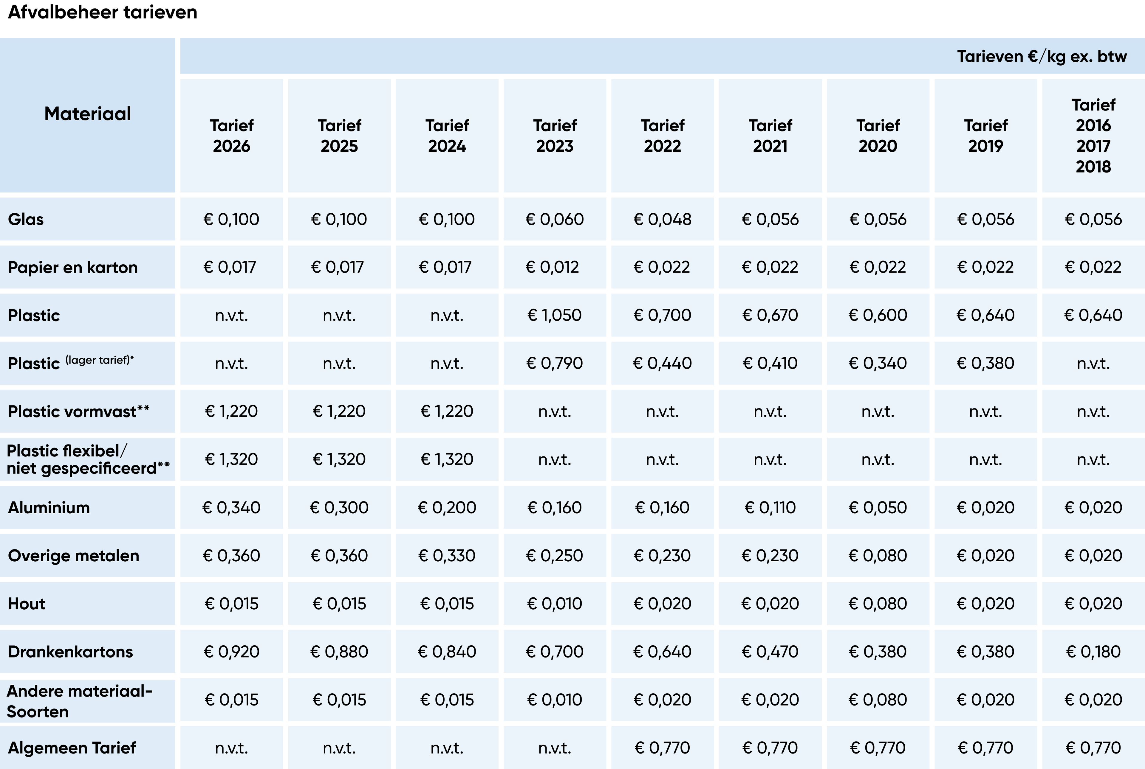 De Afvalbeheerbijdrage Verpakkingen kent verschillende tarieven, afhankelijk van het soort materiaal. Het tarief wordt bepaald door de kosten die het inzamelen, scheiden en recyclen van het specifieke materiaal met zich meebrengen. Dus hoe duurzamer de verpakking, hoe lager de bijdrage! Deze eventuele extra kosten zorgen ervoor dat sommige producten een prijsverhoging hebben gekregen. Hoe duurzamer het product en de verpakking, des te lager de afvalbeheerbijdrage.