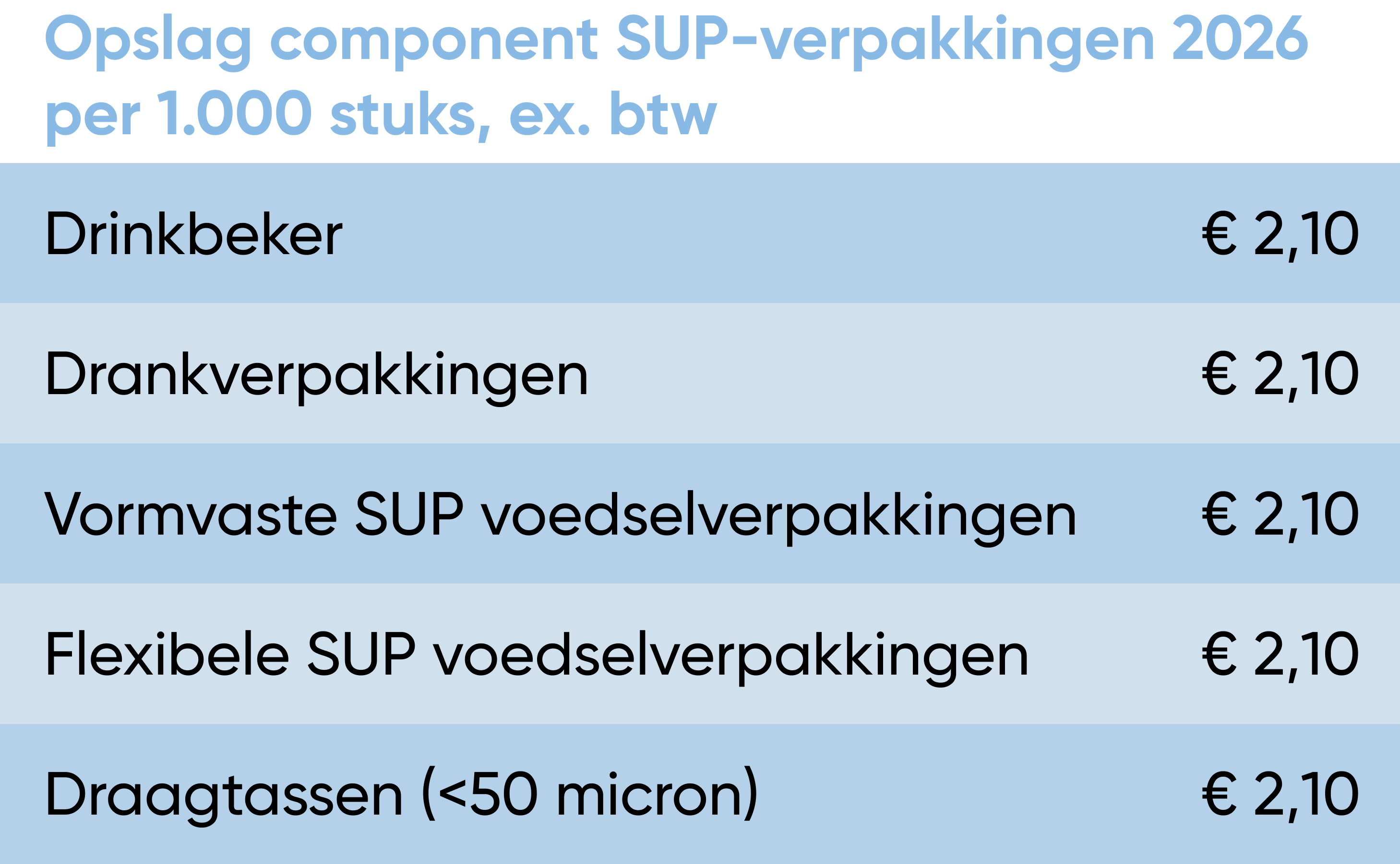 De eventuele extra kosten van zowel de SUP-opslag als de afvalbeheerbijdrage zijn al verwerkt in de prijzen die je op onze website ziet. Wanneer er een SUP-opslag van toepassing is staat dit aangegeven op de productpagina. Daarnaast is dit ook op de factuur terug te vinden.